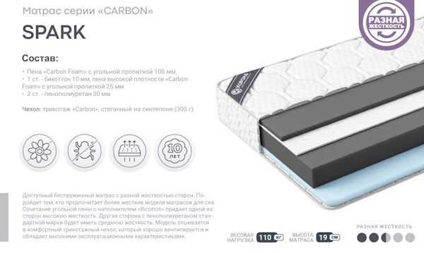 Доступный беспружинный матрас с разной жесткостью сторон. Подойдет тем, кто любит «спартанские условия» во время сна. Сочетание угольной пены с жестким наполнителем «Bicotton» придает одной из сторон высокую жесткость. Другая сторона с пенополиуретаном стандартной марки будет иметь среднюю жесткость. Модель комплектуется комфортным трикотажем, хорошо вентилируется и обладает высокими эксплуатационными характеристиками.