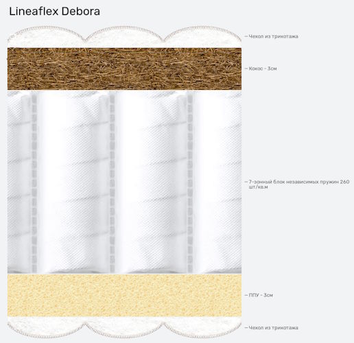 Матрас Дебора от российского производителя «Линия Флекс» имеет «независимый» пружинный блок и комбинированную двухстороннюю жесткость, поэтому Вы можете менять упругость спального места по настроению. Подходит для людей с большим весом. Высота изделия составляет 20 сантиметров.