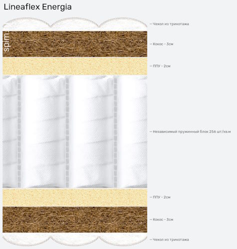 Матрас Энергия спокойно принимает большой вес (до 140 кг), не теряя при этом формы. Быстро восстанавливает поверхность после нагрузки. Основой служит беспружинный блок, помещенный в равномерные слои кокосовой койры и пены ERGOFLEX. Чехол выполнен из хлопкового трикотажа, отлично регулирующего температуру.