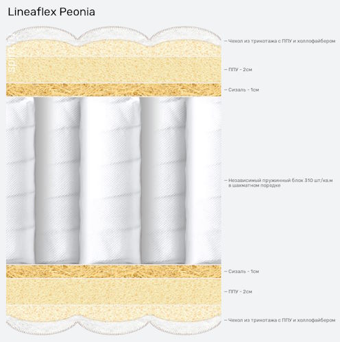 Ортопедический матрас Peonia (Пион) – анатомическая модель от российского бренда «Линия Флекс». Идеальный симбиоз упругости и высокой эластичности. Высота составляет 21 см. Изготавливается по новейшей итальянской технологии из экологически чистых, нетоксичных материалов. Уникальный блок с независимой системой пружин обеспечивает неповторимый комфорт и дарит настоящий отдых во время сна.