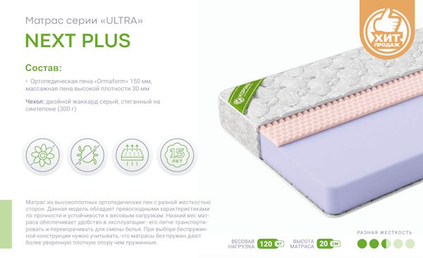 Матрас из высокоплотных ортопедических пен с разной жесткостью сторон. Данная модель обладает превосходными характеристиками по прочности и устойчивости к весовым нагрузкам. Низкий вес матраса обеспечивает удобство в эксплуатации - его легче транспортировать и переворачивать для смены белья. При выборе беспружинной конструкции нужно учитывать, что матрасы без пружин дают более уверенную плотную опору чем пружинные.