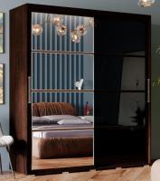 Модель изготовлена из ЛДСП, одна раздвижная створка выполнена из стекла, а вторая – зеркальная, такой прием облегчает конструкцию и позволяет расширить пространство, внутри модель состоит из многочисленных полок и ящиков для белья и одежды, а также отделения со штангой для плечиков.